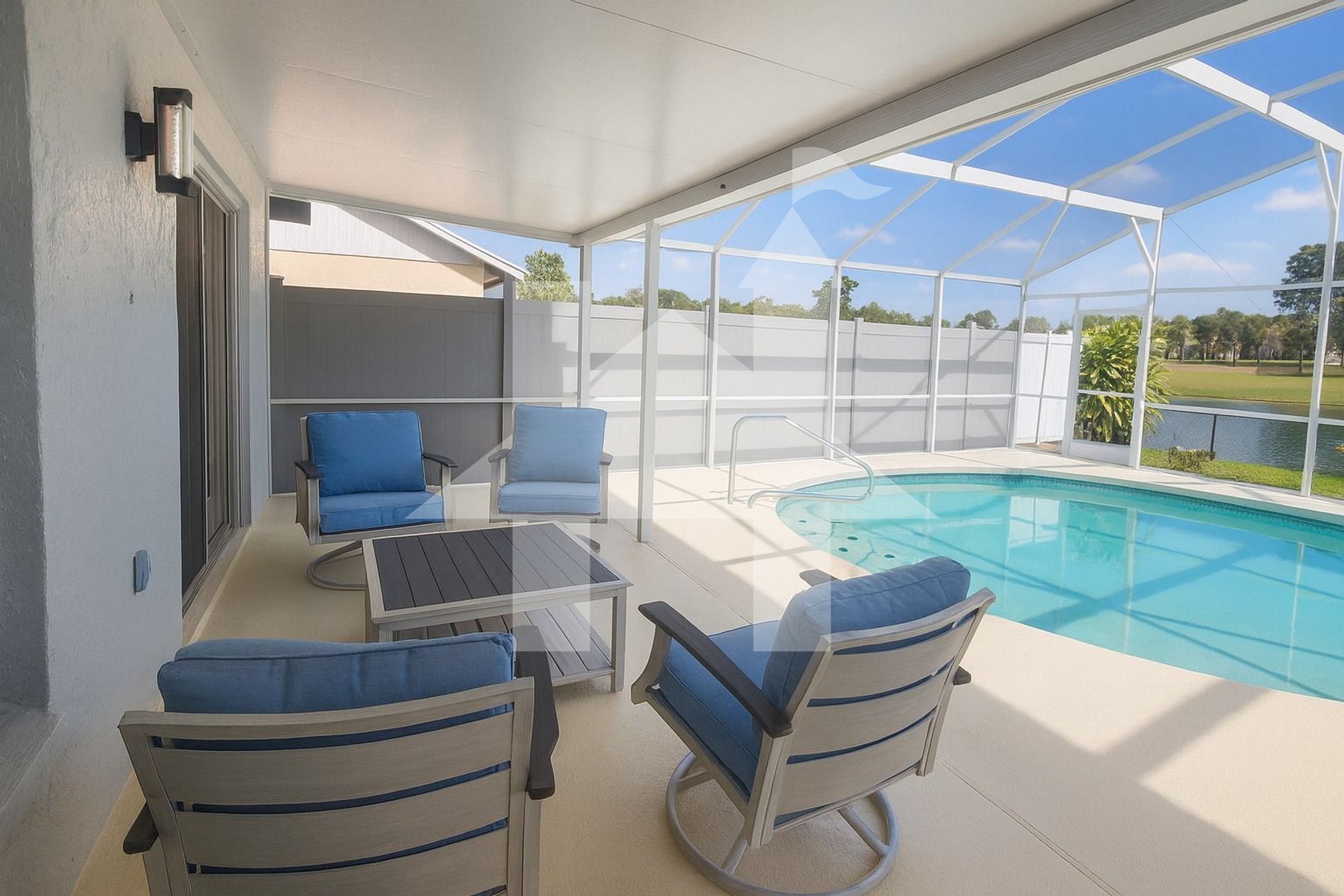 Com quase 1.500 sq ft de espaço interno com piso frio climatizado, esta casa térrea acomoda confortavelmente até 8 hóspedes em três quartos e dois banheiros. A sala de estar apresenta teto alto, decoração moderna e uma grande TV para streaming (canais ao vivo gratuitos ou suas assinaturas como Netflix, Hulu, Prime). A área de jantar para seis pessoas conecta-se à piscina privativa com tela e ao jardim cercado—garantindo total privacidade.