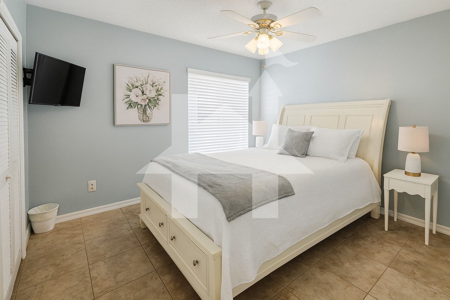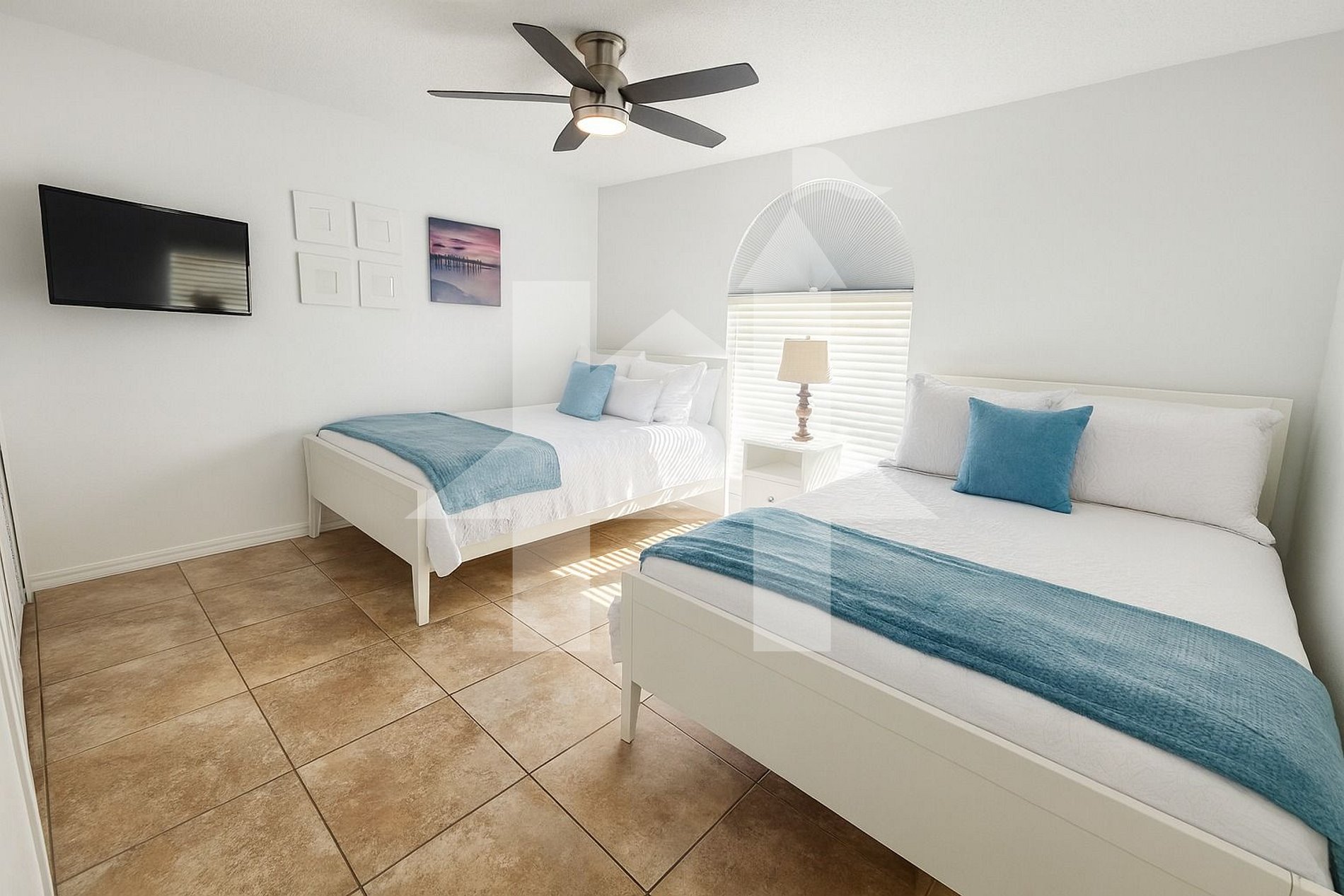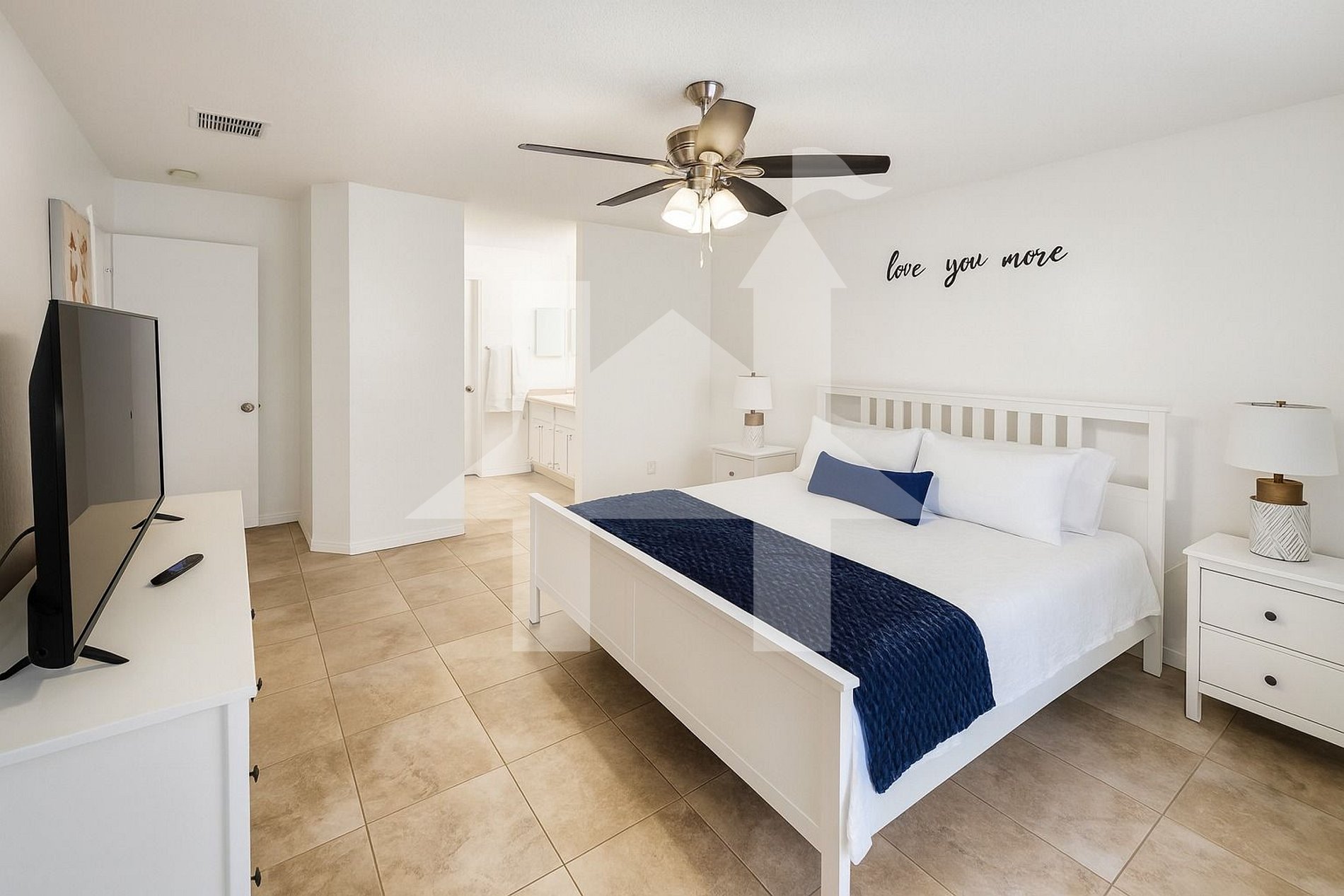 Quartos: Suíte Master: Cama king‑size, Roku TV, amplo closet e banheiro privativo com pia dupla, chuveiro walk‑in, vaso sanitário e secador de cabelo. Quarto 2: Cama queen, Roku TV, armário. Quarto 3: Duas camas queen, Roku TV, guarda‑roupas. O segundo banheiro possui banheira com chuveiro, pia, vaso e secador.