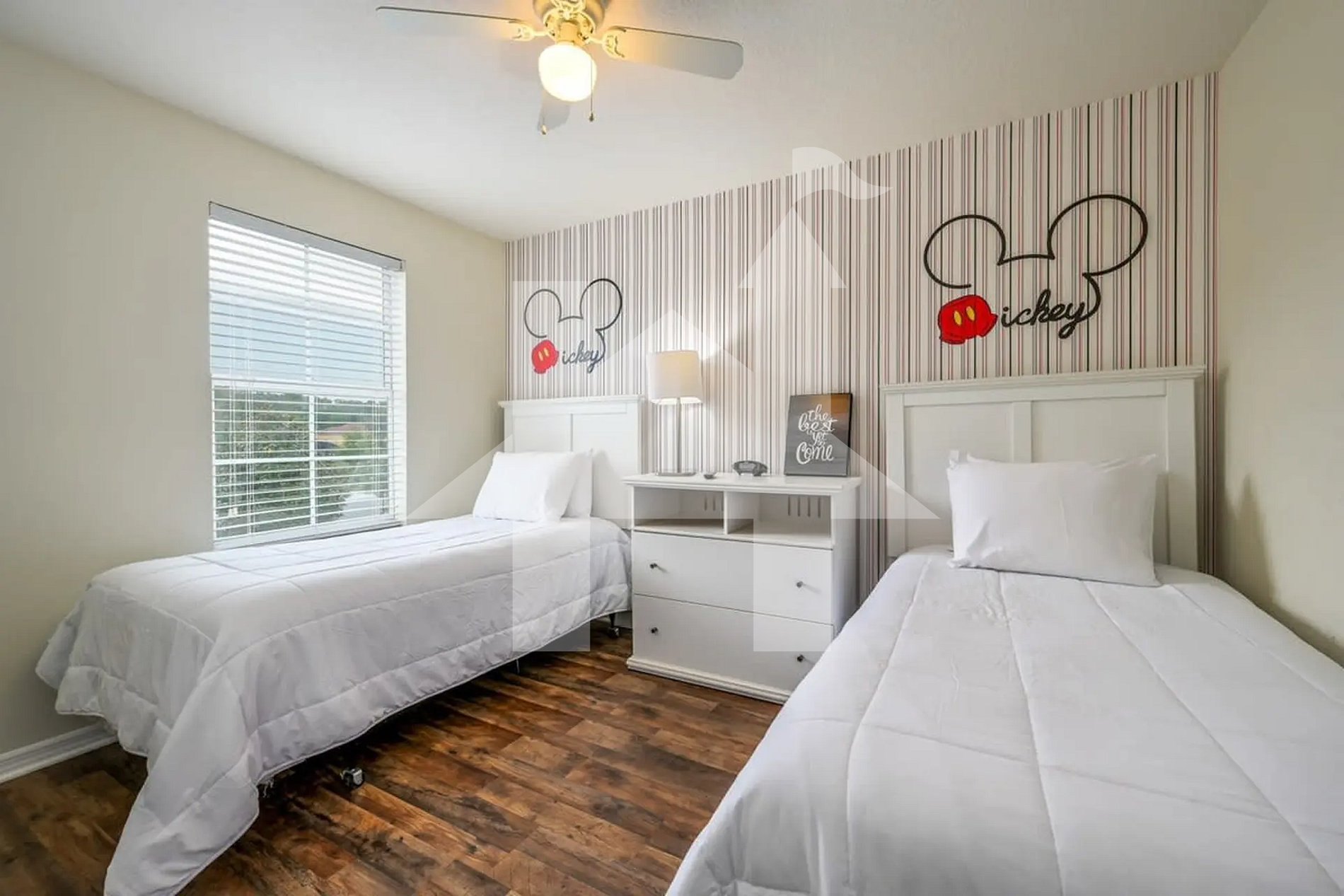 No térreo, há um quarto com cama king e banheiro privativo, garantindo praticidade e conforto. No andar superior, a suíte master com cama king oferece privacidade e relaxamento. O quarto temático do Mickey, com duas camas de solteiro, e o quarto adicional, também com duas camas de solteiro, compartilham um banheiro bem equipado.