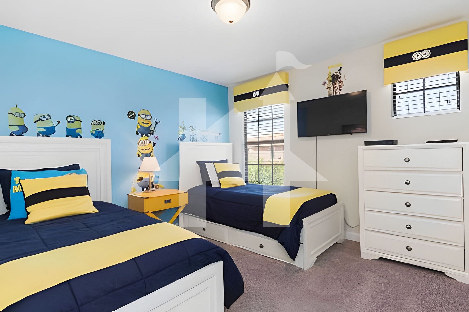 Quarto 4 temático Minions com cama de solteiro e cama de criança