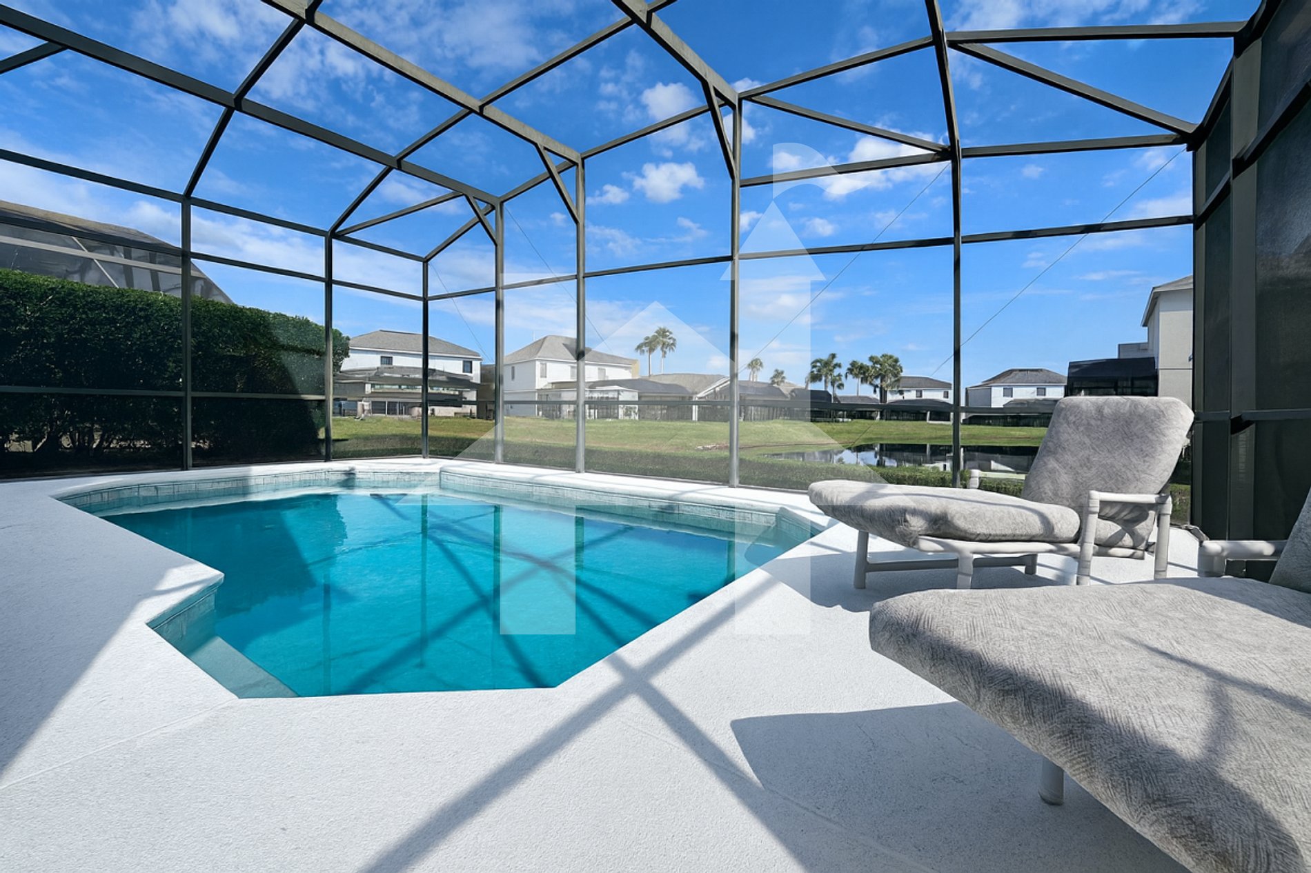 Piscina privativa com vista para o lago, perfeita para relaxar após um dia nos parques. Área externa privativa com total tranquilidade.